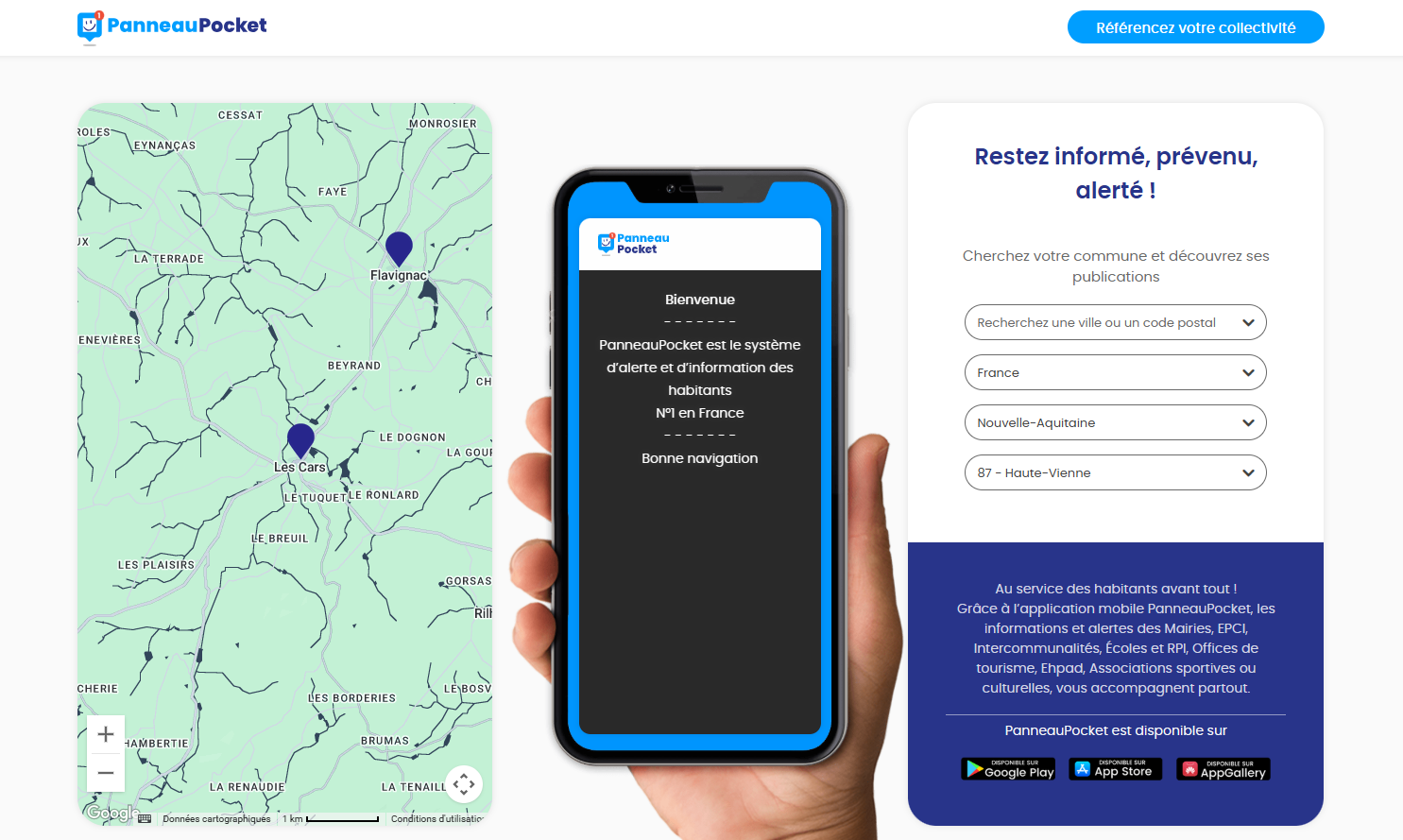 - Téléchargez gratuitement l'application sur votre téléphone ou tablette en recherchant PanneauPocket sur AppStore ou PlayStore.