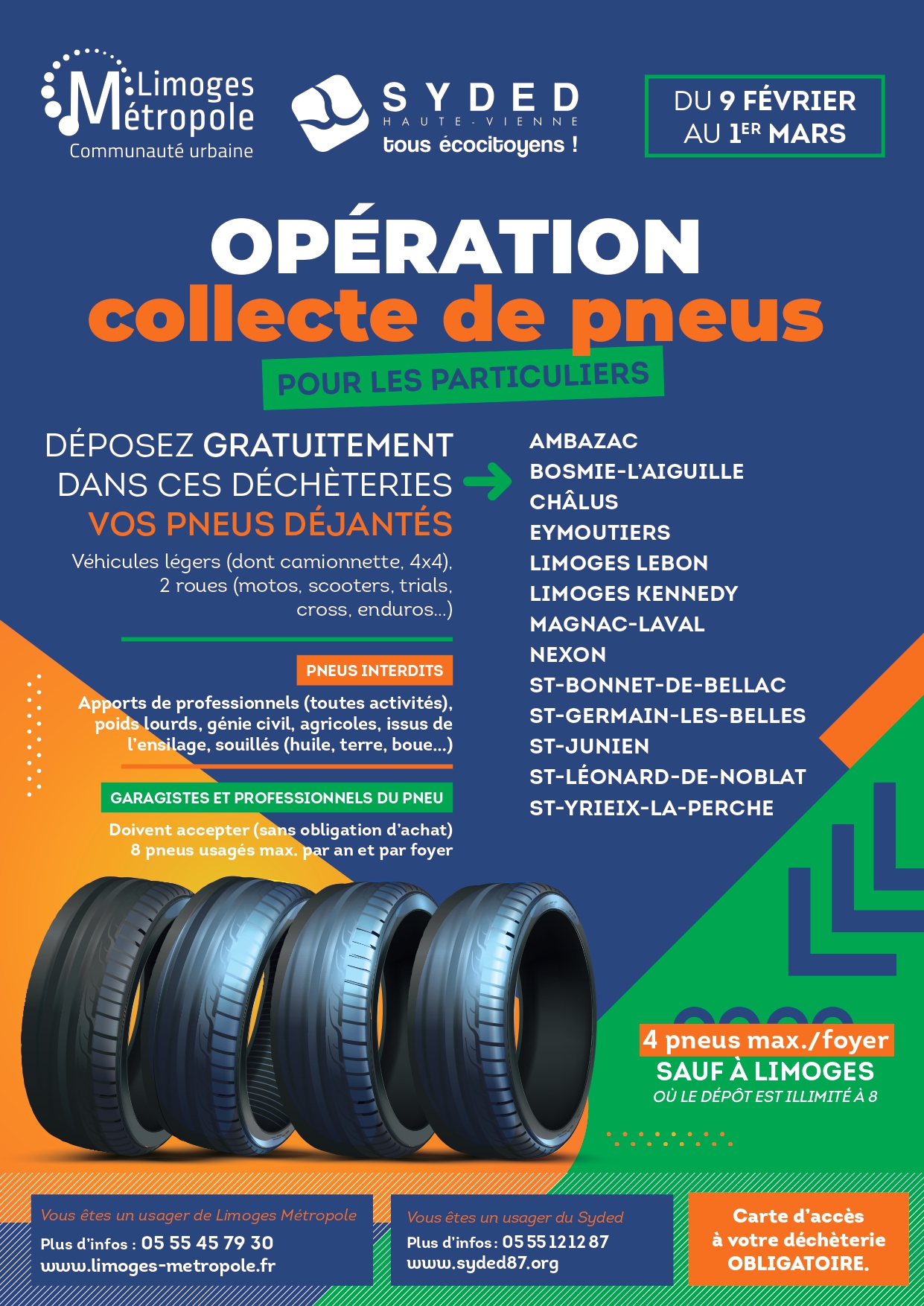 Pour rappel, en dehors de cette opération ponctuelle organisée une fois par an par Limoges Métropole et le SYDED Haute-Vienne, les garagistes et professionnels du pneu ont l’obligation légale de reprendre gratuitement vos pneus usagés (sans obligation), dans la limite de 8 unités par an et par foyer.
